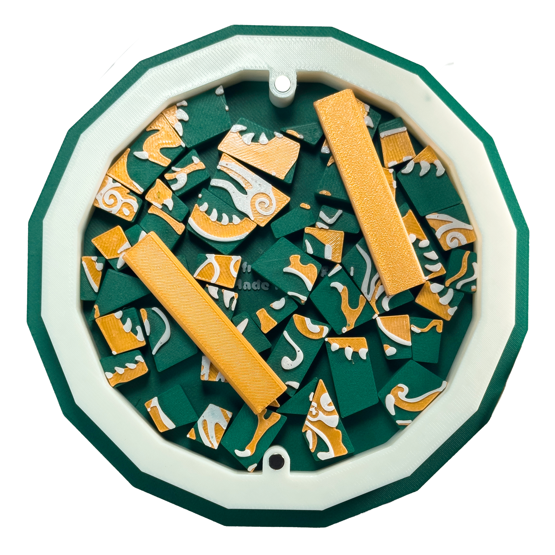Three to Four different, high-quality PETG filament colors. Unlike other 3D printed puzzles on the market made with less durable PLA filament, PETG is made to withstand any element. You can leave it in a hot car or stick it in the dishwasher, it won’t melt and it won’t deform easily. PETG also gives it a highly precise shape.